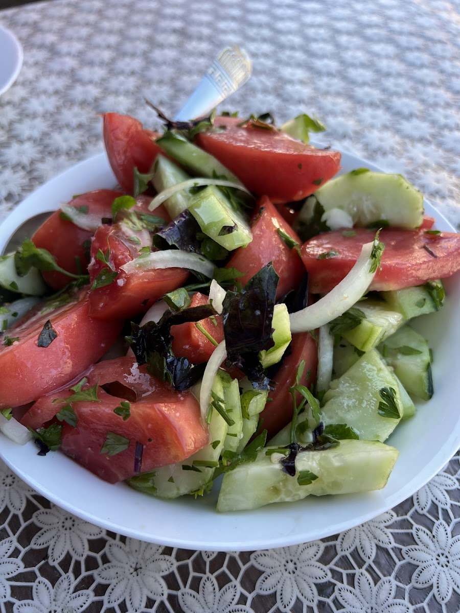 For those seeking something lighter yet equally delicious, the Mushrooms with Sulguni offer a flavorful combination of earthy mushrooms paired with Georgia's beloved Sulguni cheese. It's a dish that highlights the simplicity and richness of local ingredients. And, no Georgian meal is complete without a refreshing salad, which is why the Tomato Cucumber Salad is an excellent choice. It offers a crisp and light contrast to the richer, more indulgent dishes on the menu. For dessert, indulge in the Cheese Pancakes-a sweet treat that rounds off your meal perfectly.